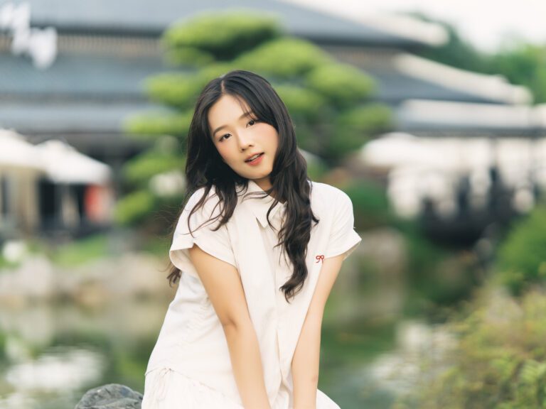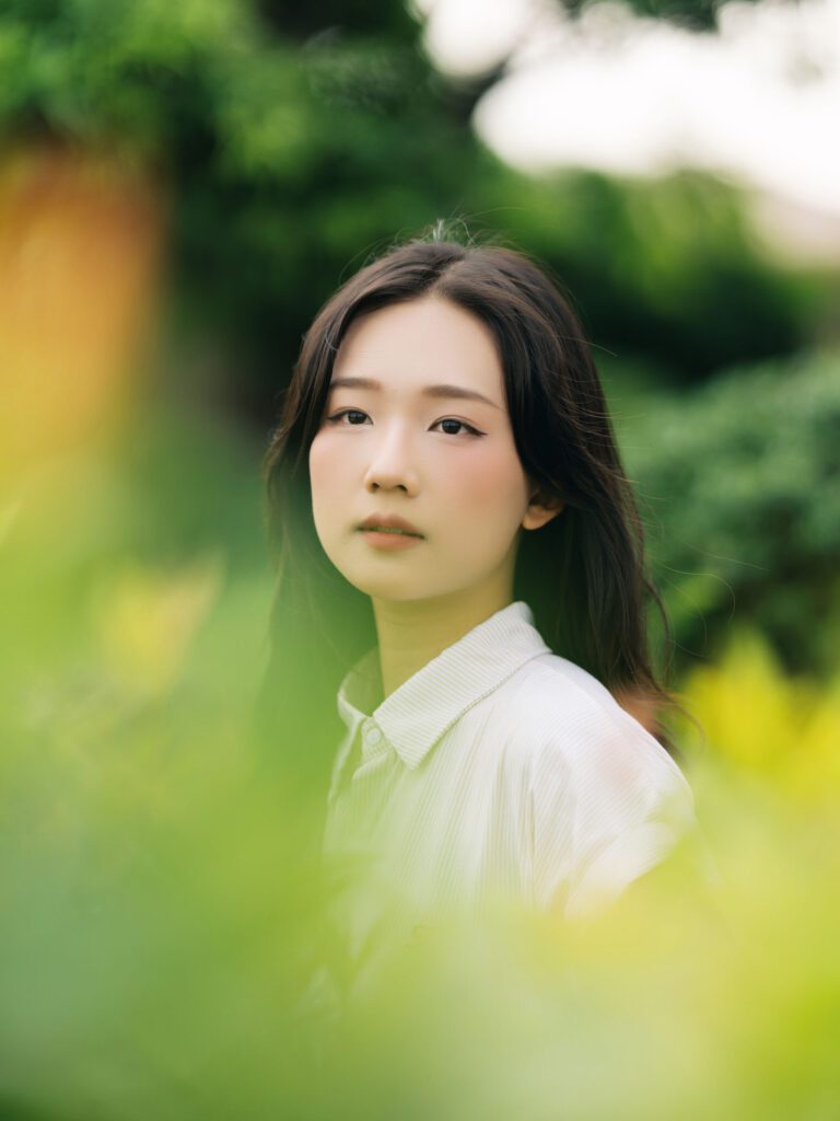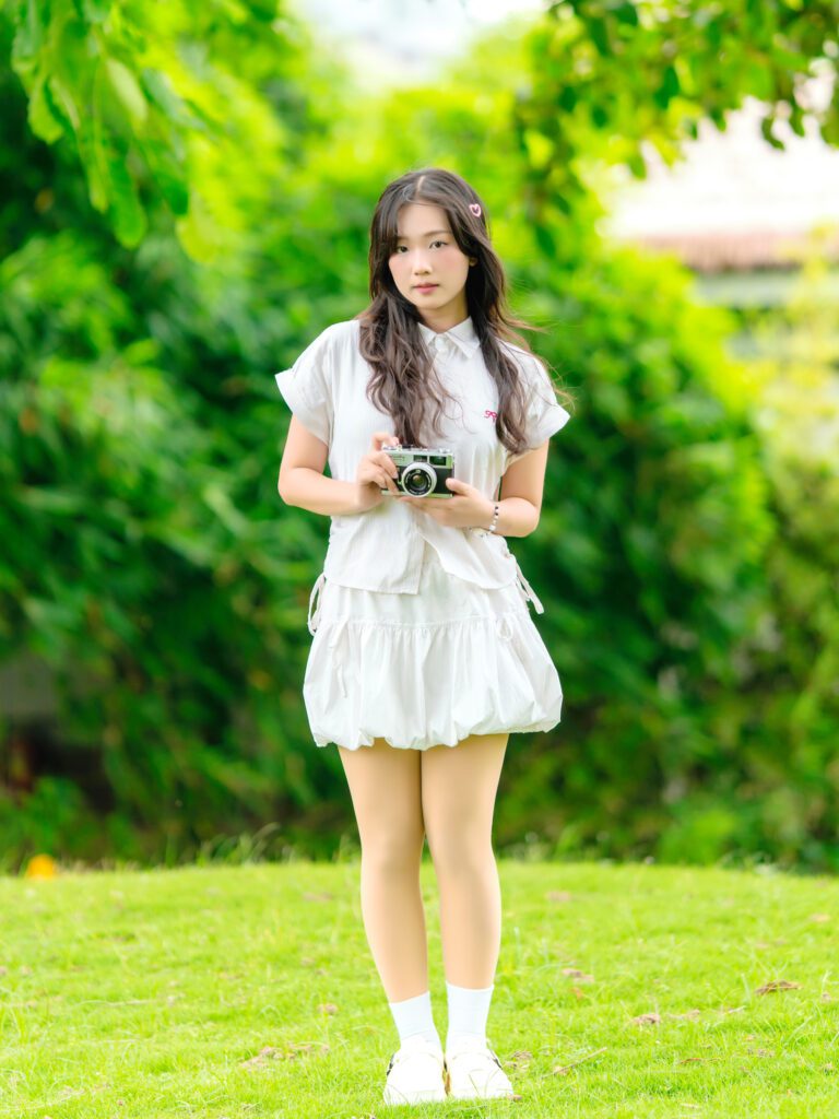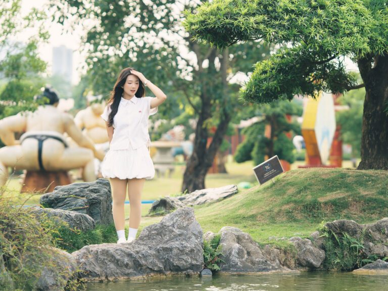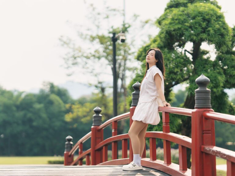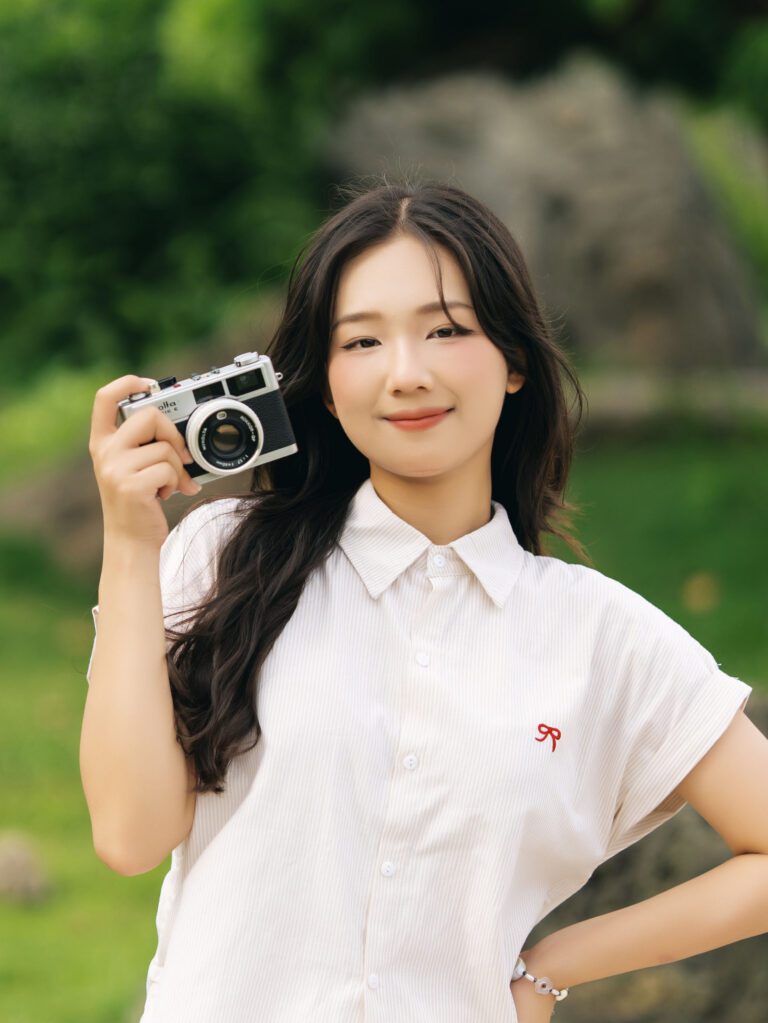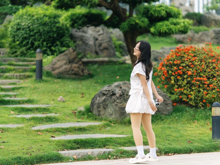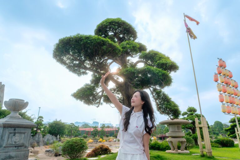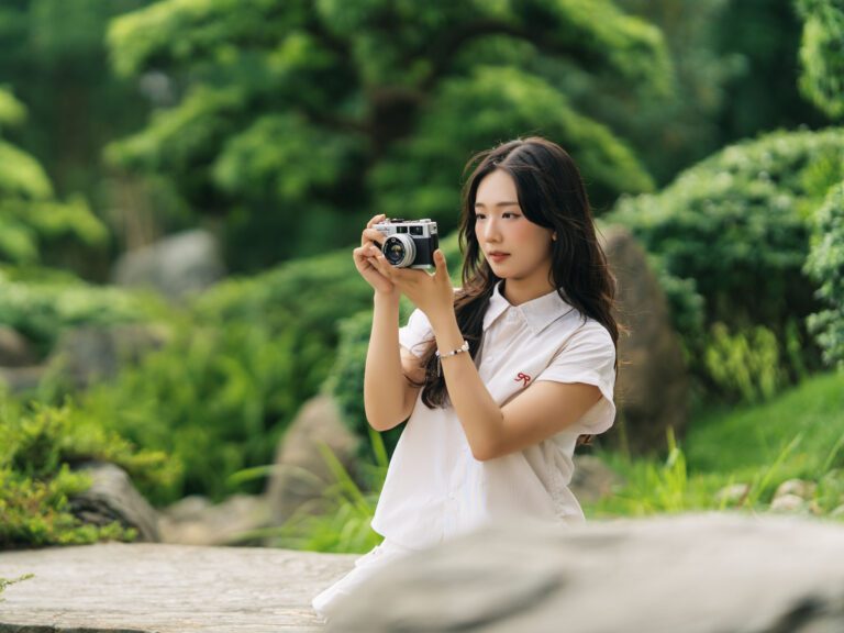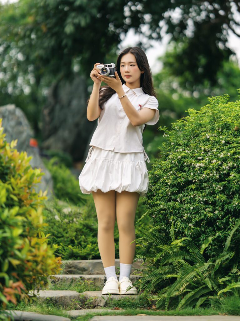Để có được một bộ ảnh đa dạng, vừa bao quát được không gian kiến trúc hùng vĩ của Vườn Nhật, vừa đặc tả được những biểu cảm tinh tế của người mẫu, tôi đã linh hoạt sử dụng hai ống kính khác nhau trên thân máy Sony A7C2.